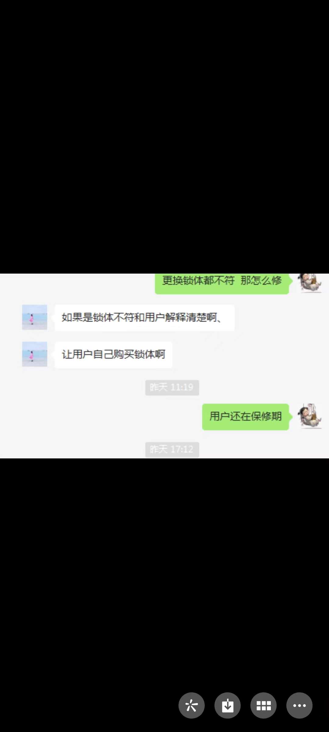 1、2022年8月29日,本人通过拼多多平台购买了云米智能门锁,1个共计1999元,对方没有出具发票。 2、2022年10月中旬出现开锁锁体只伸进一半的情况,当时没在意,随后3个月内出现情况越来越频繁,已经影响到了家人进出 3、2023年3月27日我联系了拼多多卖家,卖家当场联系维修师傅上门,维修师傅通过电话联系分析是锁体出现问题,联系厂家寄了一个新群体,过几天锁体到了,师傅说锁体跟我的不匹配用不了,后面更换锁体需要自己出钱,我不认可 4、原因如下1、锁体在保修期内。2、厂家寄错锁体跟我没关系。3、至今一个多月所谓的维修师傅没有上门确定到底是哪里出现问题。 5、我的投诉诉求是1、在规定时间内免费维修好锁体并延长保质期。不管换新维修,实在不行全款退货也行。